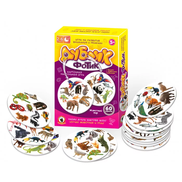 «Дублик» - это игра, которая сможет развеселить и увлечь каждого! В комплекте карточки с разным набором картинок. Игрокам необходимо найти совпадающие изображения быстрее всех. В процессе игры участники изучат новых представителей животного мира, а поможет в этом буклет-подсказка с названиями животных. В правилах вы найдете несколько вариантов игры. Память, скорость и внимание - Ваши главные помощники. Вперёд за победой! Игра подойдет для 2-6 игроков.В комплект игры входит 60 карт и правила игры.