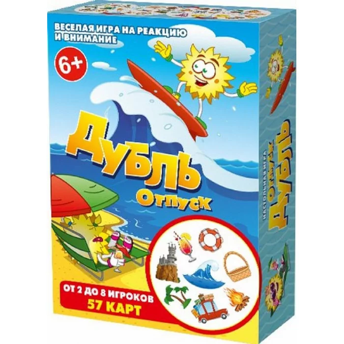 Размер упаковки: 15,5 х 11 х 3,7 см Диаметр карточек: 8,6 см Вид упаковки: картонная коробка Страна производитель: Россия Материал: картон Комплектация: 57 круглых карточек Вес: 140 гр. Возраст ребенка: от 6 лет Занимательная настольная игра «Дубль 5. Отпуск» отличный вариант для проведения веселого вечера с друзьями или в кругу семьи! Цель игры: находить один общий предмет на двух разных круглых карточках. Игра тренирует реакцию, внимательность и логическое мышление.