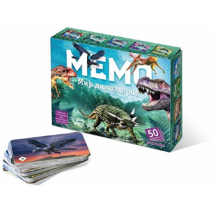 В состав игры входит 50 парных карточек, то есть всего 25 пар карточек. Перед началом игры карточки перемешиваются и раскладываются на столе картинками вниз. Играют несколько игроков. В свой ход игрок переворачивает 2 любые карточки и показывает их остальным игрокам. Если карточки одинаковые, игрок забирает их себе и делает еще один ход. Если разные - переворачивает их и кладет обратно, а ход переходит к следующему игроку. Выигрывает игрок, собравший к концу игры наибольшее количество карточек. Данная игра Мемо Мир динозавров будет интересна еще и с познавательной точки зрения. На карточках размещены изображения динозавров. В состав входит буклет с описанием всех динозавров, изображённых на карточках.