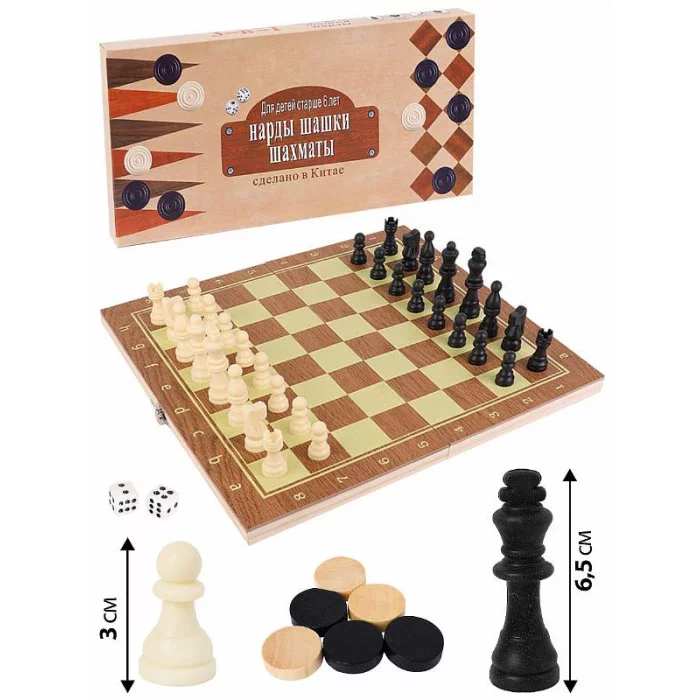 Набор настольных игр поможет приятно провести время и потренировать мозг. Нарды и шахматы благоприятно сказываются на развитии детей и взрослых. А секрет популярности шашек заключается в гениальной простоте их правил и огромных возможностях комбинаций. Проводите досуг с пользой! Материал фигур: пластик. Размер поля: 34 см.