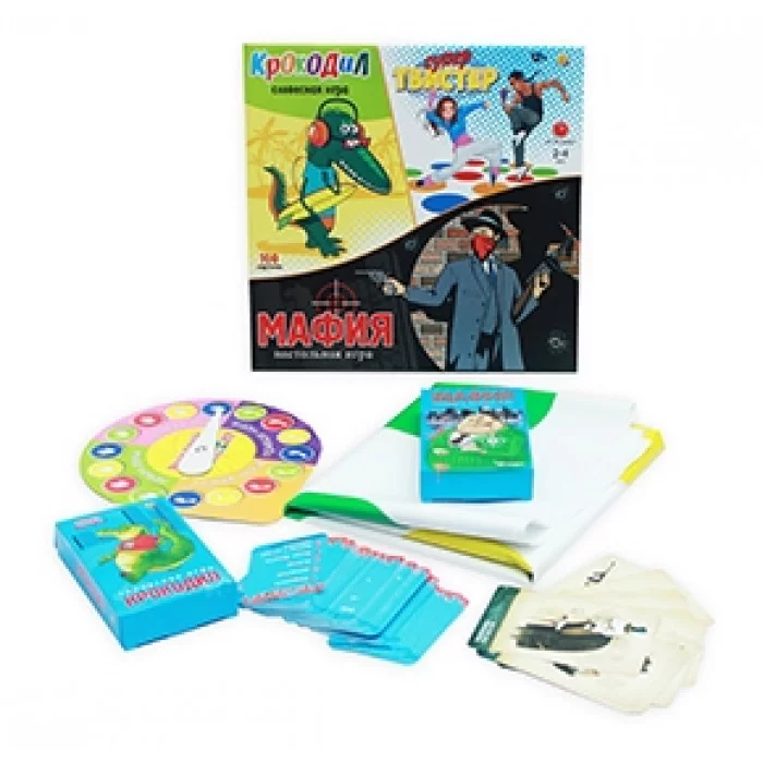 Теперь любимые игры в одной коробке! Словесная игра "Крокодил", командная ролевая игра "Мафия", весёлая игра на гибкость "Супер-Твист" - гарантированное веселье для Вас и Ваших друзей. Предназначено для игроков в возрасте от 12 лет. Произведено в России.