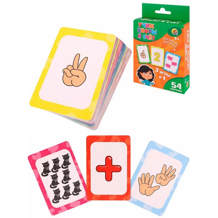 «Учим цифры и счёт» - обучающая настольная игра. Она познакомит ребёнка и с простыми математическими действиями, такими как сложение и вычитание, так и с теми, которые посложнее - умножение и деление. Кроме того малыш узнает понятия «больше» и «меньше», научится соотносить названия цифр с их изображениями, а также поймёт, как показывать их на пальцах, и узнает, как же определить, сколько забавных зверюшек прячется на карточках.