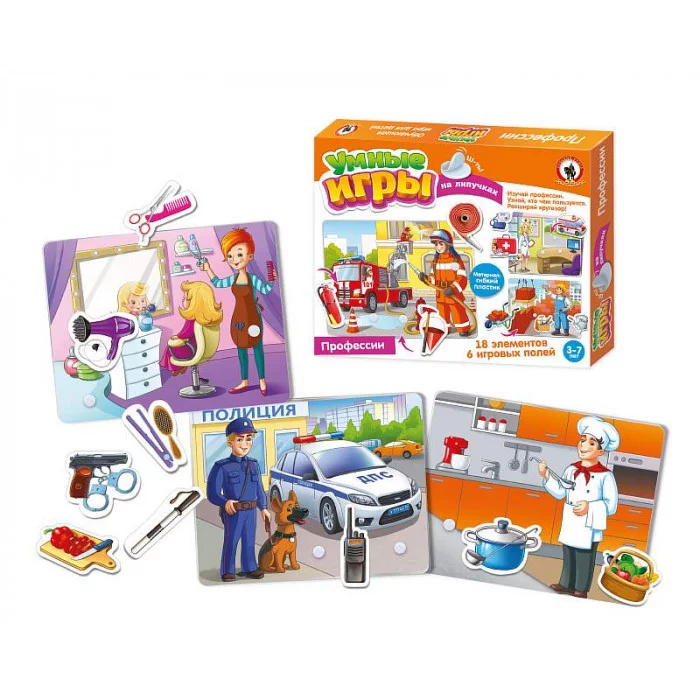 Серия «Умные игры на липучках» – это развивающие игры с дидактическими заданиями для малышей. Играя, дети изучат основные профессии и узнают, какие предметы необходимы людям в той или иной профессиональной сфере.