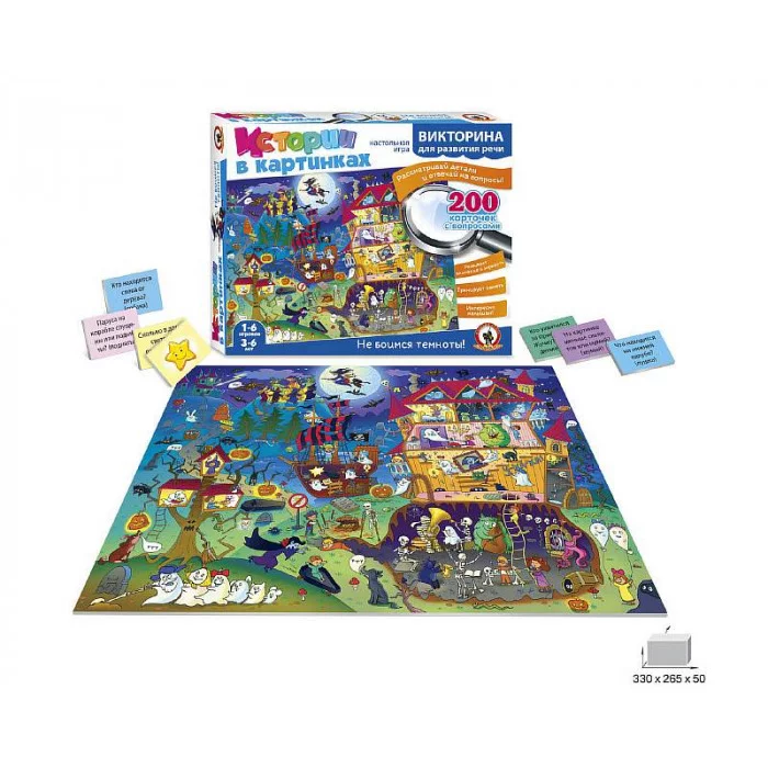 На игровом поле изображена волшебная поляна, гора с танцующими колдуньями, замок, пиратский корабль и дом с привидениями и забавными скелетиками. Все персонажи очень добрые и веселые. Малыши с удовольствием будут разглядывать веселые картинки. В комплекте 200 разноплановых вопросов с ответами для всестороннего развития малышей. В процессе игры взрослый зачитывает вопрос, а малышам необходимо найти на игровом поле нарисованный ответ. Кто быстрее всех нашел правильный ответ, получает п