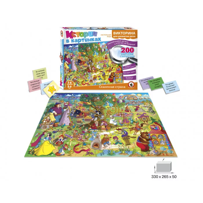 Игровое поле разглядывать очень интересно, на нем изображены герои самых известных сказок и истории, которые с ними случились. В комплекте 200 разноплановых вопросов с ответами для всестороннего развития малышей. В процессе игры взрослый зачитывает вопрос, а малышам необходимо найти на игровом поле нарисованный ответ. Кто быстрее всех нашел правильный ответ, получает призовую карточку со звездочкой. Выигрывает игрок, набравший наибольшее количество звездочек.