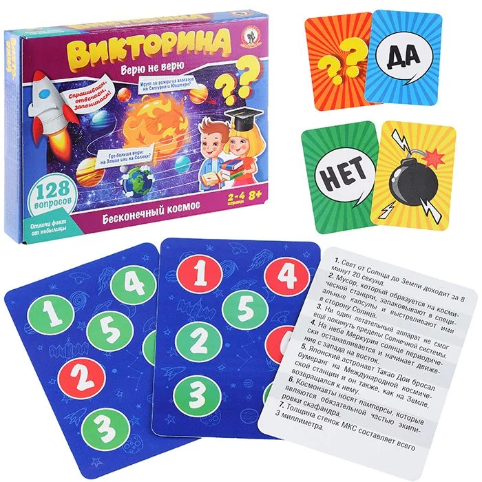 В комплекте более 120 тематических вопросов: факты и небылицы. От игроков потребуется не только смекалка и эрудиция, но и умение отличать факт от небылицы. Игрок в свой ход задает понравившийся вопрос, все игроки делают ставки: "ДА" или "НЕТ". Тот, кто ошибся, получает штрафную карточку "Бомбочку". Кто набрал 4 штрафные карточки, выбывает из игры. Игроки могут использовать те вопросы, которые представлены на карточках, а также могут самостоятельно искать или придумывать вопросы. Игра-викторина будет интересна детям и взрослым, поможет задуматься об уникальности и бесконечности нашей.
