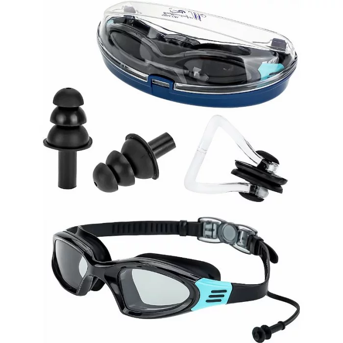 Очки для плавания с широким углом обзора, который позволяет видеть все, что происходит на твоей дорожке. Удобная посадка. В комплекте: зажим для носа, беруши. Упаковка: пластиковый футляр. Цвет: чёрный.