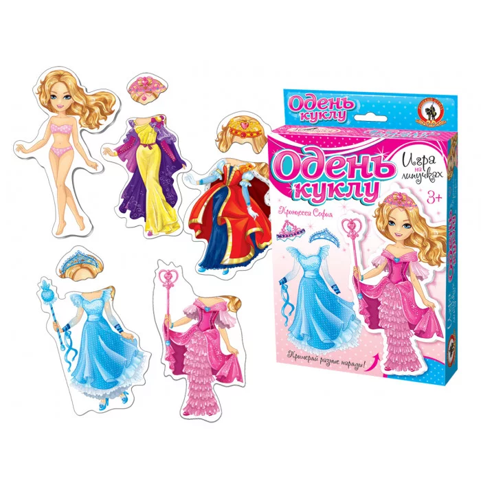 Набор для игры «Одень куклу» создан специально для юных модниц! Игра развивает фантазию и чувство стиля. Кукла изготовлена из толстого переплетного картона. Готовой фигуркой можно играть и с легкостью менять одежду. Наряды крепятся к кукле на липучках, поэтому менять платья и головные уборы очень просто и удобно! Подбирай наряды и головные уборы для принцессы Софии так, чтобы они прекрасно смотрелись на девочке. Какой наряд сегодня оденет маленькая модница? Тебе решать!