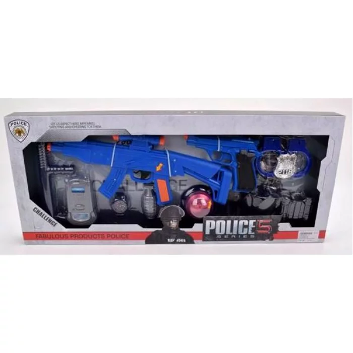 Упаковка: коробка Габариты: 70х5х30 (см) Механизм на батарейках (световой и звуковой эффекты) Состав набора: автомат, пистолет, мигалка, кобура, бинокль, граната, наручники, значок