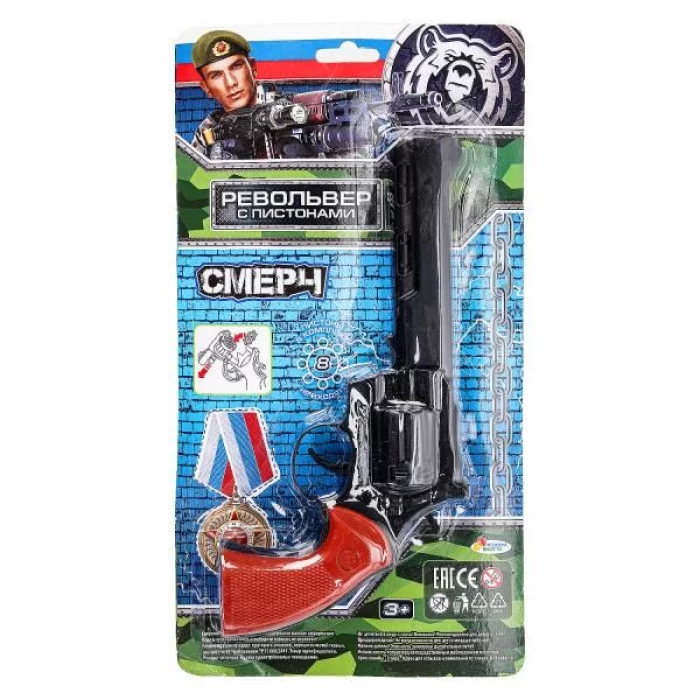 Игровое оружие с реалистичным звуком и лёгким дымовым эффектом станет любимой игрушкой вашего ребёнка. Револьвер легко заряжается и перезаряжается, нужно просто откинуть 8-зарядный барабан и установить кольцо с пистонами (приобретаются отдельно). На упаковке имеется схема установки пистонов.