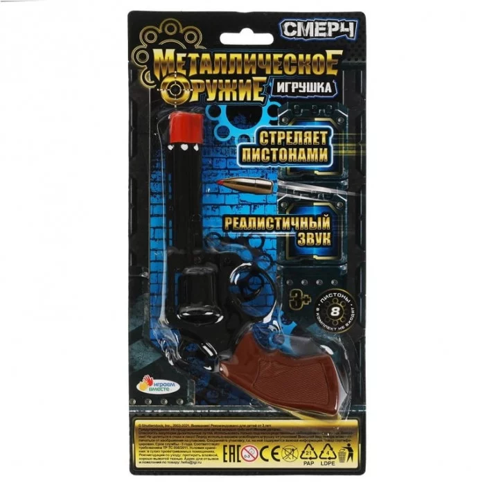 Металлический револьвер «Смерч» ТМ «Играем вместе» непременно понравится юному герою: - реалистичный звук - стреляет пистонами - 8 зарядов - стильный дизайн С этим игровым оружием ваш ребёнок будет придумывать увлекательные спецзадания, защищать мир и стоять на страже порядка. С таким револьвером маленький герой станет самым метким стрелком. Набор подойдёт для активных игр на воздухе и в помещении. Игры с оружием ТМ «Играем вместе» помогут развить: - координацию движений - воображение - ловкость и меткость - внимание - моторику Размер: 20 х 11 х 3 см. Материал: металл + пластмасса. Пистоны в комплект не входят. Рекомендовано детям от 3-х лет.
