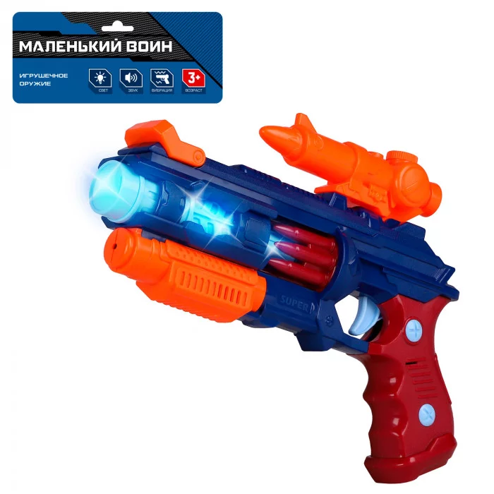 Игрушечный пистолет торговой марки Маленький воин - один из лучших подарков, который можно преподнести маленькому герою. Он обязательно понравится любителям устроить межгалактическую перестрелку. При нажатии на курок игрушка воспроизводит звуки, красиво светится и вибрирует! Кроме того, в дополнение к динамичной подсветке и звуковым эффектам, у пистолета двигается ствол и вращается барабан. Данная игрушка не стреляет пульками, поэтому с ней могут играть даже самые юные поклонники игрового оружия. Игра способствует развитию фантазии, координации движений, слухового и визуального восприятия, внимания.
