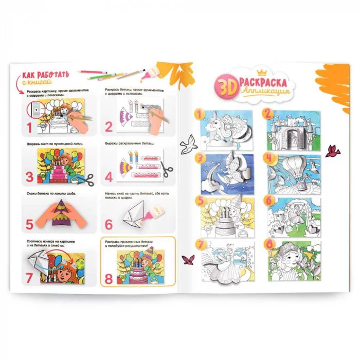 «3D-раскраска-аппликация. Для девочек» под брендом «МалЯвич» – это творческая тетрадь для создания объёмных картин! Внутри 8 картинок принцесс и детали к ним. Раскрасьте, вырежьте, приклейте – и полюбуйтесь результатом! Готовые картины можно подарить друзьям, украсить ими комнату или устроить выставку. Рекомендовано для детей дошкольного возраста.
