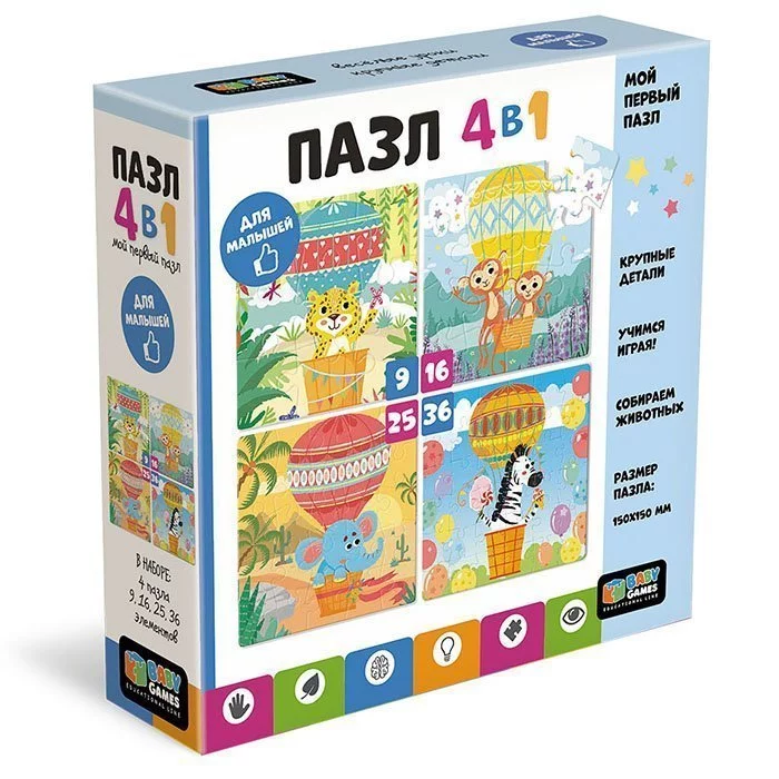 В комплекте: 4 пазла 9, 16, 25, 36 элементов