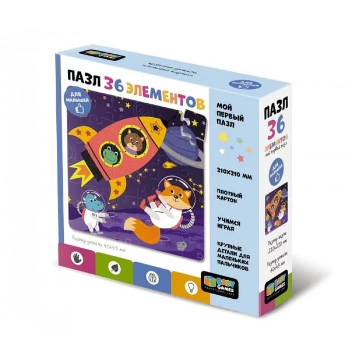 Размер упаковки: 14,8 х 4,2 х 14,9 см Размер пазла: 21 х 21 см Размер одной детали: 4 х 4,5 см Вид упаковки: картонная коробка Страна производитель: Россия Материал: картон Количество деталей: 25 шт. Вес: 95 гр. Возраст ребёнка: 3+ Пазлы – это очень занимательное и полезное хобби для малышей дошкольного возраста. В процессе собирания пазла ребенок тренирует память, логическое мышление, внимательность и мелкую моторику рук. Особенности: - яркое, забавное изображение зверят в космосе; - крупные детали для маленьких пальчиков; - плотный картон.