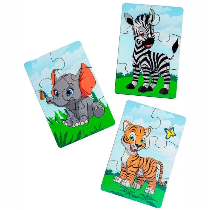 Набор состоит из 3х красочных деревянных пазлов, в каждом из которых 6 элементов.