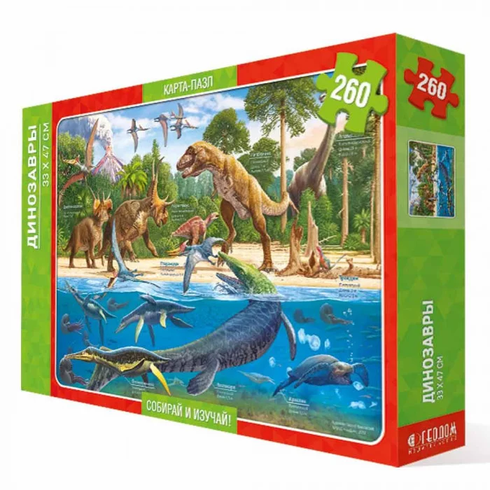 Карта-пазл «Динозавры» состоит из 260 деталей, которые выполнены из высококачественного картона.На пазле представлена реконструкция древних ящеров и их среды обитания, выполненная художником с палеонтологической точностью. Собирая игру-головоломку, Ваш малыш узнает много нового об этих удивительных существах.В процессе игры благодаря деталям разнообразной формы ребенок развивает мелкую моторику, усидчивость, логику и мышление, воображение и способность анализировать.