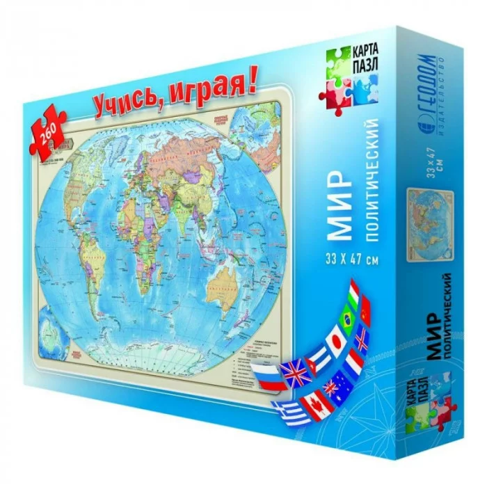 Ваш ребенок в процессе игры с большим интересом изучит политико-административное устройство мира и познакомится со столицами государств. Пазлы с картой мира позволяют узнать, какие океаны омывают материки и острова. Это отличный метод познакомиться с особенностями географии уже с малого возраста. Играя, ребенок развивает воображение, пространственное мышление, внимание, память и способность анализировать! Познавайте окружающий мир вместе с ребенком, собирая карты-пазл!