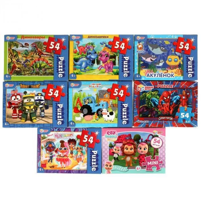 - 8 вариантов пазлов в упаковке: «Динозаврики», «Акулёнок», «Синий трактор», «Супергерои», «Cry Babies», «Robot Trains», «Hairdorables», «Динозавры»