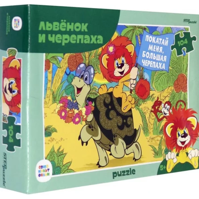Пазл «Львенок и Черепаха» состоит из 104 деталей. Его картинка наглядно показывает нам слова из мультфильма: "Покатай меня, Большая Черепаха". Характеристики пазла: стандартные детали пазла (3 × 2,3 см); размер собранного изображения - 23 × 33 см; качественное яркое изображение; материал – картон; экологически чистые, нетоксичные материалы (компания Step Puzzle гарантирует высокое качество пазла и точность подгонки). Пазл подходит для детей от 5 лет. Детям и даже взрослым Пазл «Львенок и Черепаха» точно понравится: он милый и добрый, а ещё сделан по мотивам любимого мультфильма. Рекомендуем также приобрести специальный клей для пазлов, чтобы скрепить детали мозаики между собой и получить цельную картинку