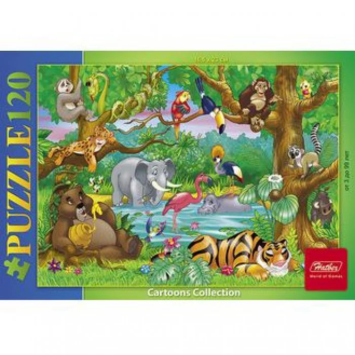 Пазл "В джунглях" - это яркая головоломка на 120 элементов, с изображением тропического леса и его многочисленных обитателей. Сборка такой картинки поможет весело и с пользой провести время, повторить вместе с ребенком названия представителей животного мира, расслабиться и отдохнуть после долгого дня. Все элементы пазлы выполнены из качественного картона, плотно прилегают друг к другу, образуя четкую красивую картину.