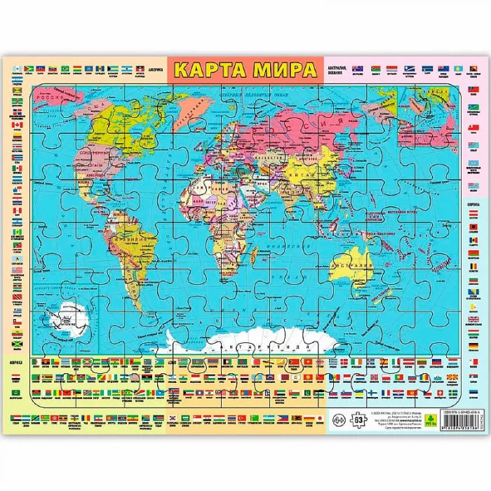 Размер упаковки: 36,3 х 28,3 х 1 см Вид упаковки: пленка Функционал: развивающие игры для детей Размер изображения в собранном виде: 36 х 28 см Страна производитель: Россия Материал: картон Количество деталей: 63 Вес: 240 гр. Возраст ребенка: 4+ Собирать пазлы – это очень полезное занятие для детей дошкольного возраста. В процессе сборки развивается мелкая моторика, координация, внимательность и логическое мышление. Пазл «Карта мира» состоит из 63 деталей. Детям обязательно понравится картинка, а также времяпровождение. Изготовлен пазл из плотного, качественного картона.