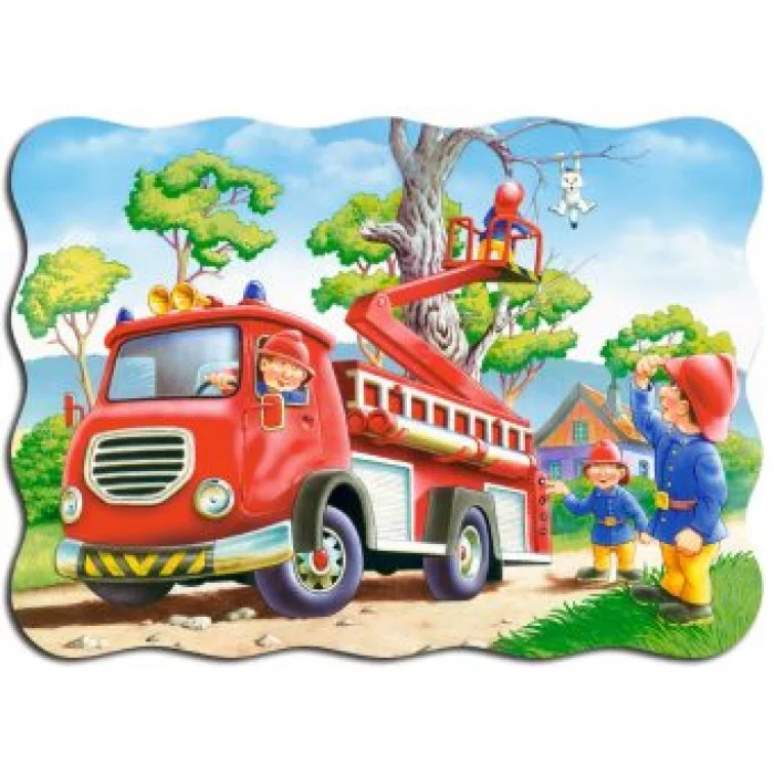 Элементы детского макси-пазла "Спасение котенка" от компании Castorland складываются в яркую картинку с изображением большой пожарной машины и 4 пожарных в форме, которые пытаются спасти белого котенка, застрявшего на дереве. Все деталиоловоломки, выполненные из прочного картона, легко соединяются друг с другом.