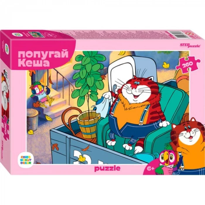 Пазл "Попугай Кеша" состоит из 260 деталей. В центре картинки мы видим кота Василия, который вальяжно развалился в кресле и на прощание перед переездом машет Кеше белым платочком. Характеристики пазла: стандартные детали пазла (2х1,7 см); размер собранного изображения -24х34,5 см; материал -картон; качественное изображение; экологически чистые, нетоксичные материалы (компания Step Puzzle гарантирует высокое качество пазла и точность подгонки). Пазл "Попугай Кеша" оценят и взрослые, и дети, ведь он сделан по мотивам нестареющего мультфильма. Для комфортной сборки пазла советуем приобрести специальный коврик. Рекомендуем приобрести специальный клей для пазлов, чтобы скрепить детали мозаики между собой и получить цельную картину.