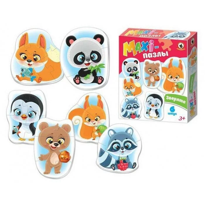 Игры серии «Макси-пазлы» - одна из самых любимых игр для малышей! В комплекте 6 пазлов с изображением очаровательных зверят: белочка, медвежонок, панда, лисенок, пингвинчик и енот. Изображения на пазлах яркие и понятные малышам. Пазлы выполнены из качественного картона и имеют разное количество деталей: от 2 до 4. Детали Макси-пазлов крупные, их удобно держать в руках. Компактный размер коробки (150х180х40) позволяет брать с собой этот набор в путешествия и поездки. Собирайте пазлы – это прекрасная возможность провести время с пользой!