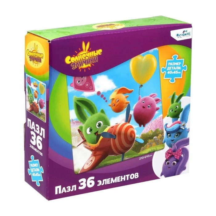 Пазл 36 элементов, основанный на любимых сюжетах мультфильма "Солнечные зайчики" понравится любому ребенку, а сборка яркой картинки принесет радость не только малышам, но и их родителям.