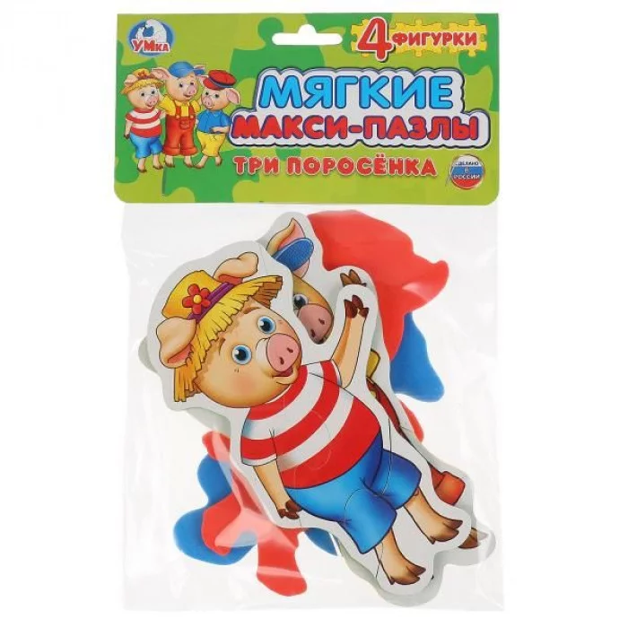 Мягкие макси-пазлы «Три поросёнка» - собственная разработка ТМ «УМка» для малышей. Они изготовлены из плотного мягкого картона, покрытого яркими, чёткими иллюстрациями персонажей из одноимённой сказки и специальной плёнкой, предотвращающей вытирание картинки. Каждый пазл состоит из 2-3 деталей, что облегчает сборку малышам, учит складывать целое из частей. Элементы идеально подходят друг к другу, края их закруглены. Всего в комплекте 4 сборных картинки. Пазлы развивают усидчивость, внимание, память, ориентацию в пространстве, мелкую моторику рук, ассоциативное мышление, тактильное восприятие. Игрушка сертифицирована.