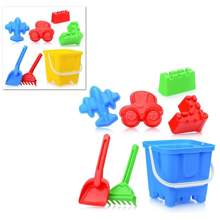 В состав набора входят: 4 формочки, совок, грабли, ведро