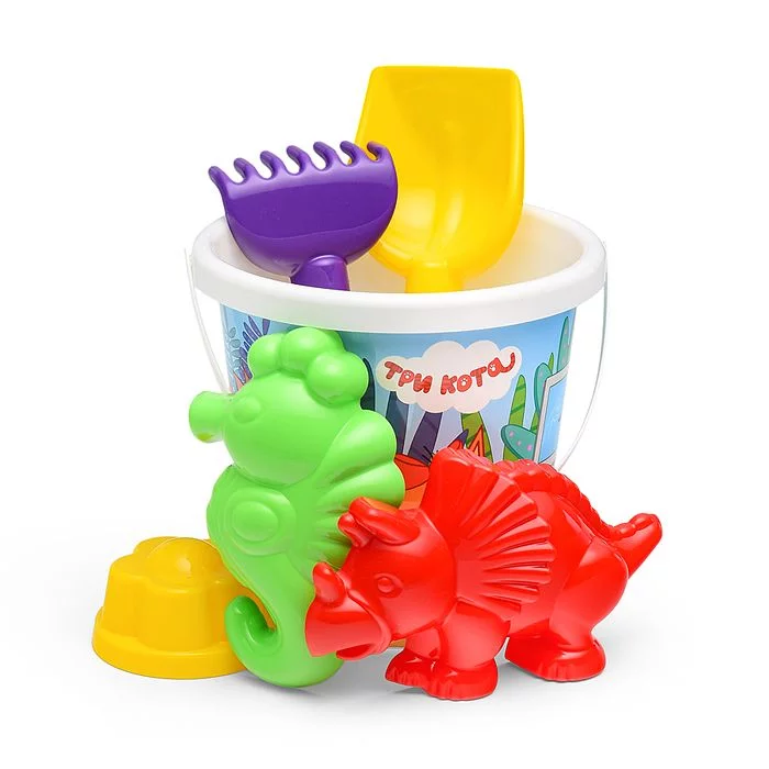 Песочный набор "Три кота" №16: Ведро с наклейкой, лопатка №5, грабельки №5, формочки (цветок + морской конёк + динозавр №1) 61328