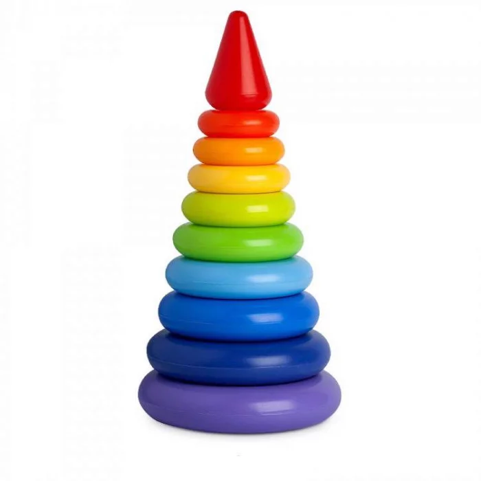 Десять из десяти человек при слове «пирамидка» представят именно ее — привычная форма, разноцветные кольца, макушка конусом. Целых девять радужных колечек необходимо собрать на стержень от большего к меньшему. Вершина пирамиды глубоко и прочно надевается на основу и фиксирует игрушку в собранном виде. Дизайн пирамидки позволяет экспериментировать — собрать кольца на стержень в обратном или в любом произвольном порядке.