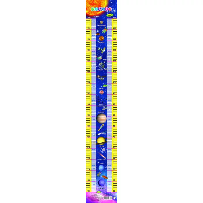 Как весело и интересно узнать точный рост ребёнка дома? В этом поможет ростомер из мелованного картона "Космос". Измеряя прогресс в росте малыша, он одновременно, будет знакомиться с планетами Солнечной системы, запоминать их название. Для этого необходимо закрепить ростомер на вертикальной поверхности и диаграмма готова к применению. Измерение составляет две шкалы от 50 до 130 в сантиметрах и от 100 до 180 в дюймах. Красочно оформленный ростомер подойдет к любому интерьеру детской комнаты, группы детского сада и других игровых комнат.
