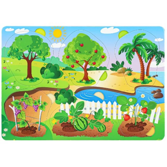 Рамка-вкладыш «Фрукты и ягоды» — это игровая доска для развития зрительного восприятия, тактильных функций, моторики пальчиков, логического и пространственного мышления у малышей. Собирая картинку, ребенок будет вставлять каждый вкладыш в отверстие соответствующей формы, учась подбирать отдельные составные части по размеру, форме и цвету. Для ягод и фруктов есть 3 вкладыша разного размера. Маленькие вкладыши прячутся под большими. Для того чтобы вкладыши было удобнее вынимать из основы, сделаны специальные выемки. Особенности: трехслойная, игра построена по принципу логического ряда.