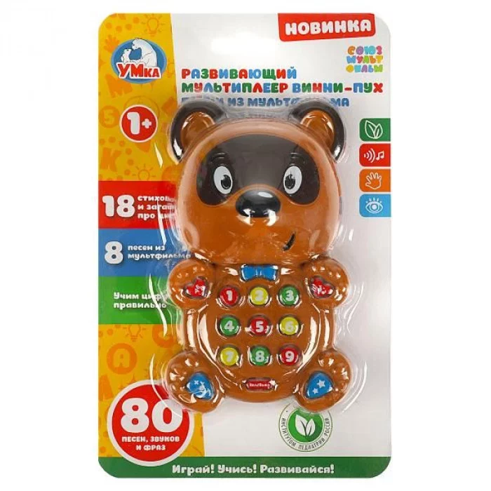 Малыш будет в восторге от этой игрушки в виде персонажа известного мультфильма. Он с удовольствием будет нажимать на разноцветные кнопочки и слушать весёлые песенки, интересные стихи и загадки, в лёгкой игровой форме изучая цифры. Благодаря компактным размерам мультиплеер удобно брать с собой на прогулки или в поездки.