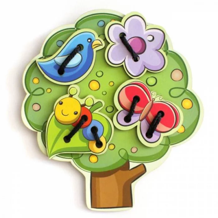 Шнуровка «Дерево» представляет собой изделие с уже завязанным шнурком. Вначале нужно показать ребенку, как играть с этой игрушкой. Для этого сами расшнуруйте предметы и снова зашнуруйте их, повторив действие несколько раз. Комментируйте свои действия – это поможет ребенку запомнить их последовательность и позволит быстрее освоить навык завязывания шнурков.