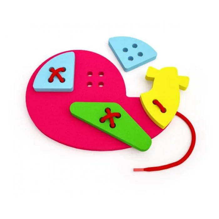 Элементы игры имеют крупные отверстия по центру каждой фигурки для того, чтобы ребенку удобно было нанизывать их на шнурок и пришнуровывать к основе.