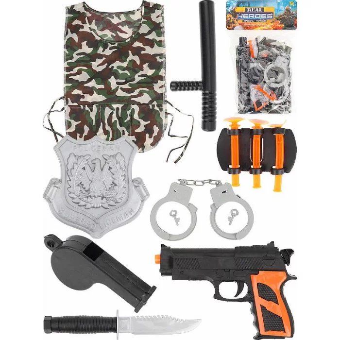 Все мальчишки любят играть в войнушку, поэтому набор полицейского из 9 предметов "Спецназ" станет отличным подарком для вашего ребенка! Предназначен для сюжетно-ролевых игр, способствует развитию мышления, фантазии и моторики. В пакете. Размер: 34,5х20х4 см.