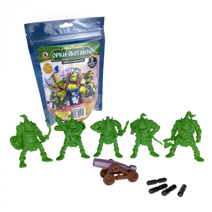 В комплект набора солдатиков входит 5 фигурок, пушка, стреляющая на 1,5 метра, и 4 снаряда. Фигурки выполнены из качественного пластика и имеют высоко детализированную прорисовку. Дети смогут рассмотреть все элементы одежды и оружия Орков-мутантов. С фигурками можно играть, устраивать сражения, коллекционировать, а собрав несколько разных отрядов, можно устроить настоящую битву. Фигурки можно раскрасить любыми модельными красками по своему желанию.