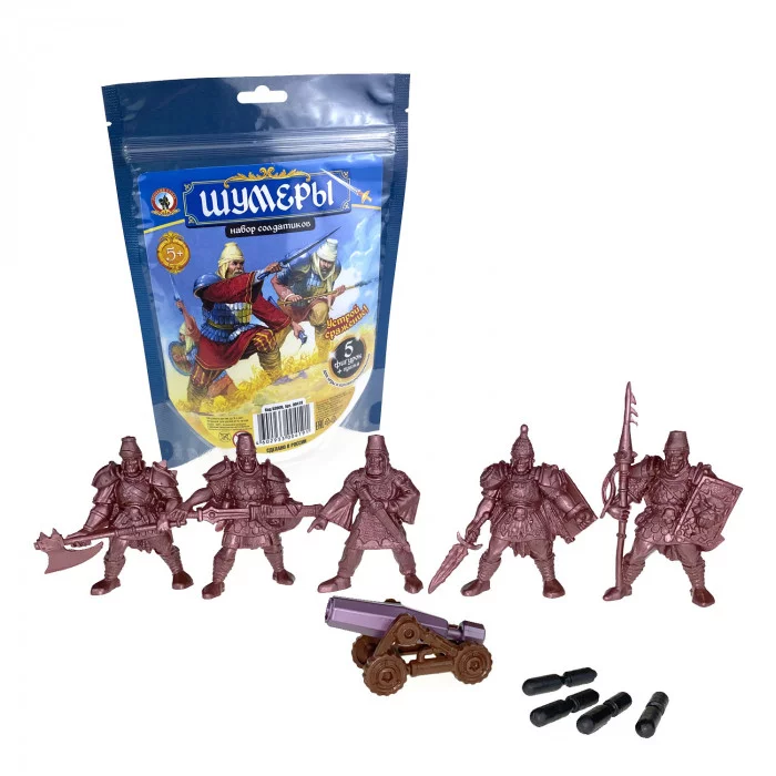 В комплект набора солдатиков входит 5 фигурок, пушка, стреляющая на 1,5 метра, и 4 снаряда. Фигурки выполнены из качественного пластика и имеют высоко детализированную прорисовку. Дети смогут рассмотреть все элементы одежды и оружия Шумеров. С фигурками можно играть, устраивать сражения, коллекционировать, а собрав несколько разных отрядов, можно устроить настоящую битву.