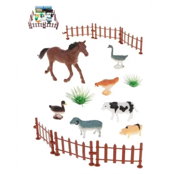В состав набора входят: 7 фигурок животных фермы, 2 элемента растительного мира, 6 элементов забора.