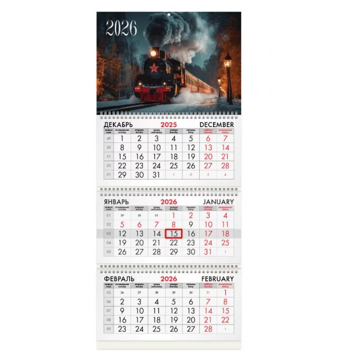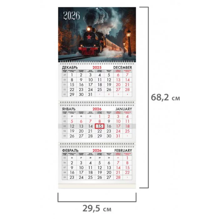 Офисный календарь на 2026 год на 3 гребнях. Состоит из 3 блоков с календарными сетками на три месяца – предыдущий, текущий и последующий. Блок календаря напечатан на офсетной бумаге плотностью 65 г/м2. Подложка изготовлена из мелованного картона плотностью 235 г/м2. Курсор-бегунок выделяет текущую дату. Вертикальный формат.