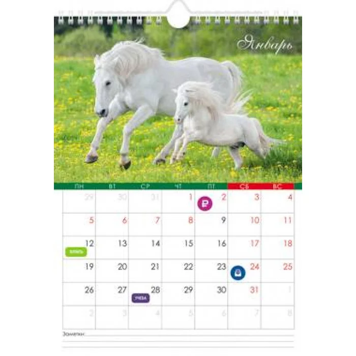 Календарь настенный перекидной 22х30 МИНИ на 2026г бум. Мелованная на гребне с ригелем с НАКЛЕЙКАМИ-Год Лошади- в инд.упак.с европодвесом