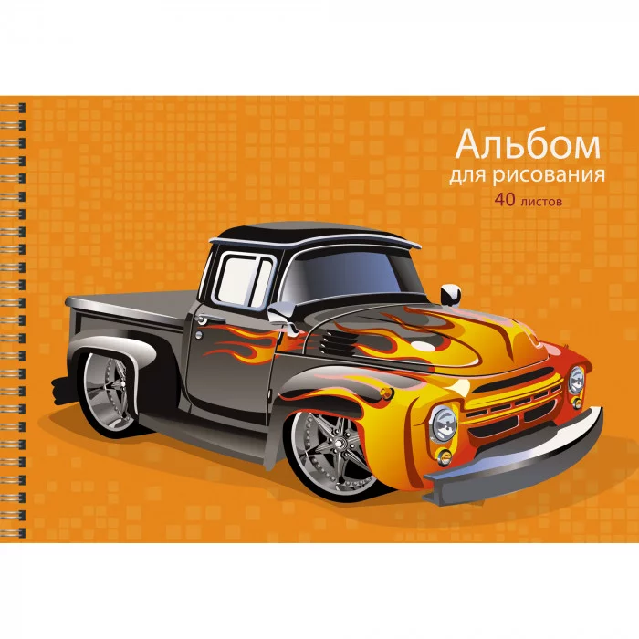 Мощный автомобиль Альбомы для рисования 40л. Гребень. Обл.: мел. картон, мат. ламин., выб. лак. Бум. оф.120г/м2. Уп./гофр. по 10 шт. в терм. пл