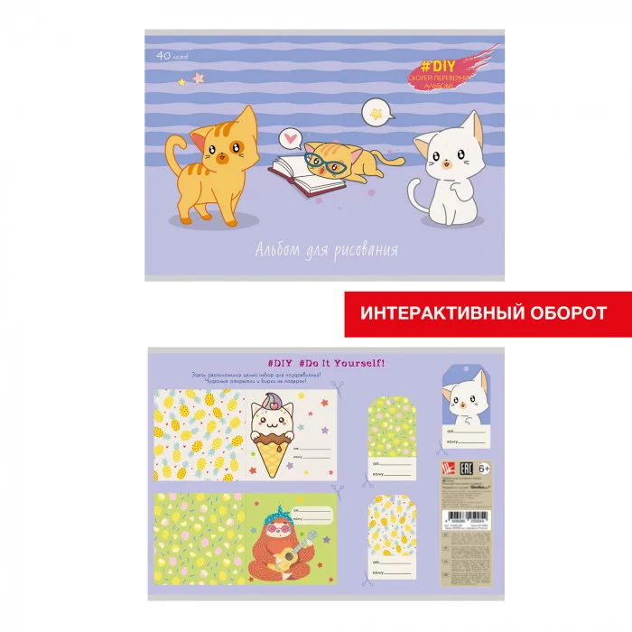 DIY Collection. Улыбнись котику Альбомы для рисования 40л. Скрепка. Обл.: мел. картон, твин-лак. Интерактив. Бум. оф.110г/м2. Уп./гофр