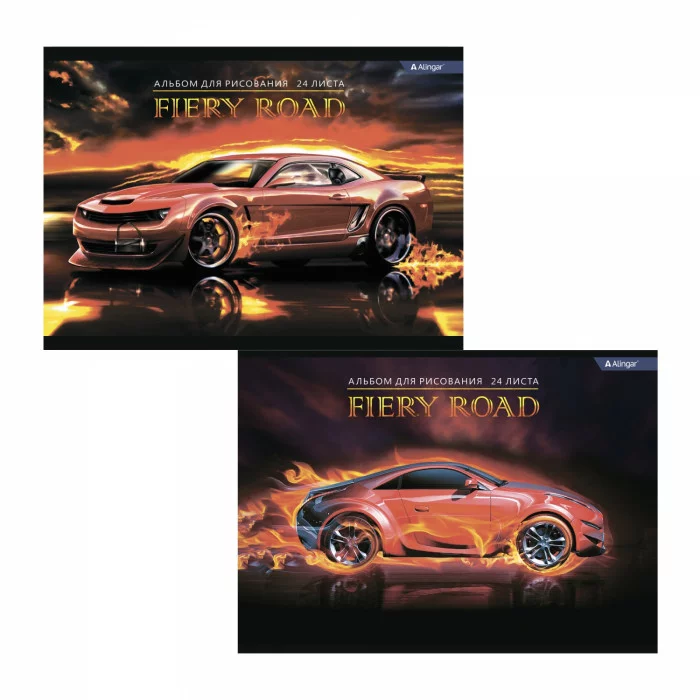 р0Альбом для рисования А4 24л. Alingar ,на скрепке ,мелованный картон(стандарт) 210г/м2, офсет 100 г/м2,, "Fiery road", 2 дизайна в пленке т/у