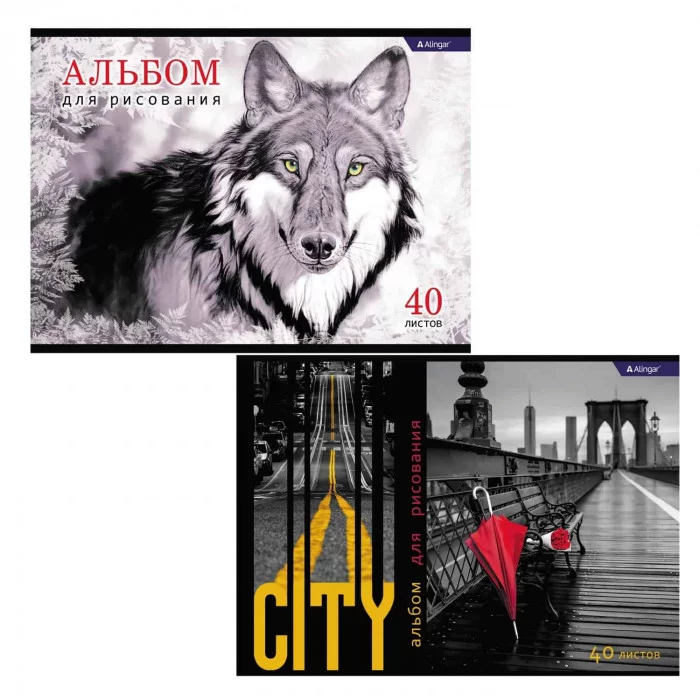 Альбом для рисования А4 40л., Alingar, на скрепке, мелованный картон (стандарт), 100 г/м2, "MIX. Волк. City." AL10769