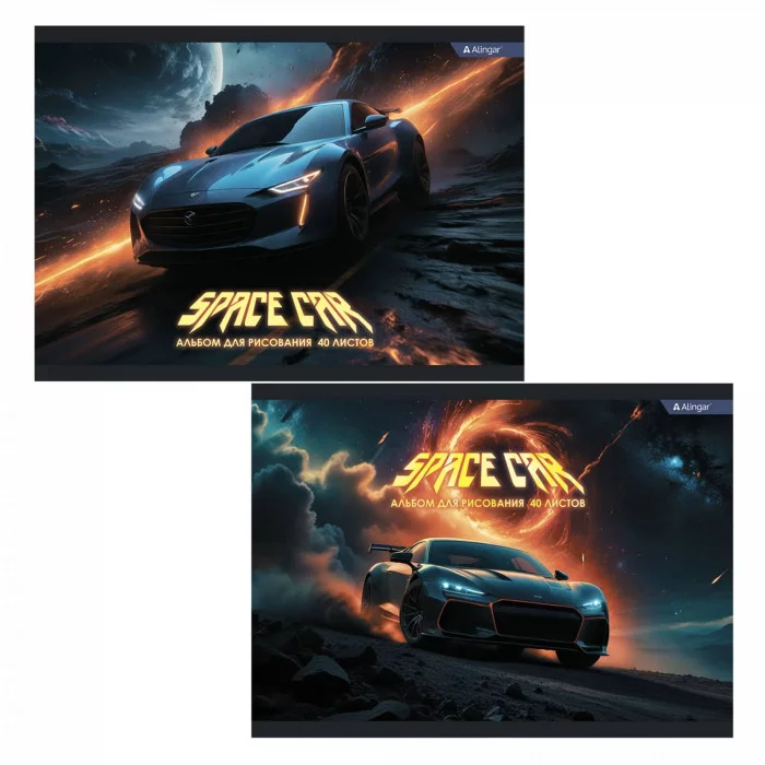 Альбом для рисования А4 40л. Alingar ,на скрепке ,мелованный картон(стандарт), 100 г/м2, "Space cars", 2 дизайна в пленке т/у AL11430